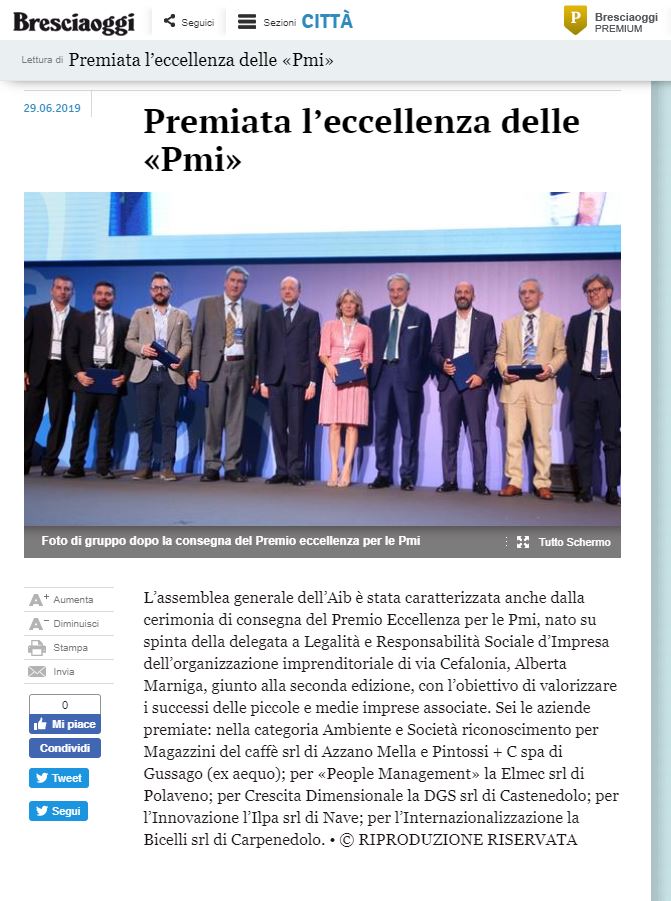 Siamo lieti di informarVi che in data 28/06/2019 abbiamo ricevuto il premio AIB per l’Eccellenza delle PMI – Crescita dimensionale istituito dall’ Associazione Industriale Bresciana.