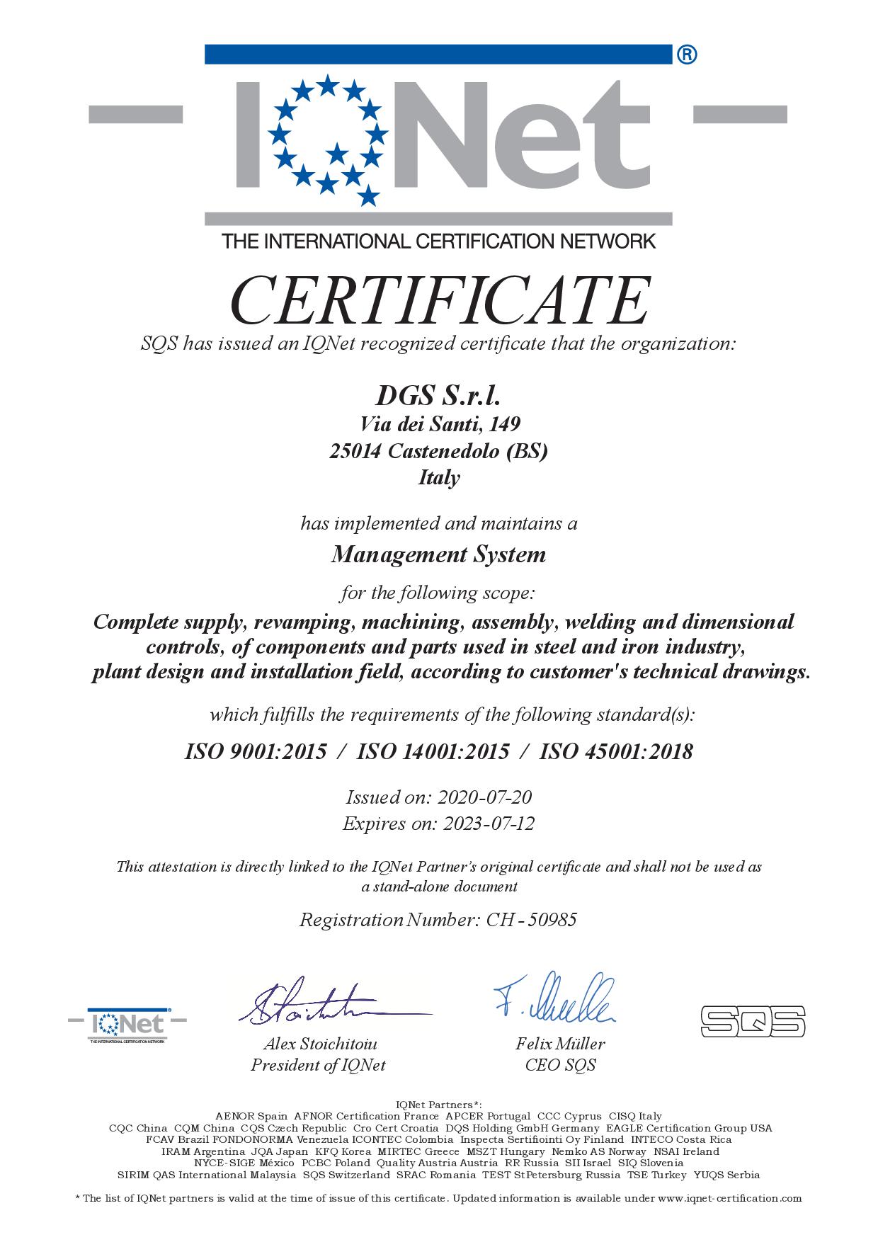 Oltre ai già conseguiti ISO 9001:2015 e ISO 14001:2015, il certificato ISO 45001:2018 è valido a livello internazionale e riconosciuto a livello mondiale tramite la rete di partner IQNet.