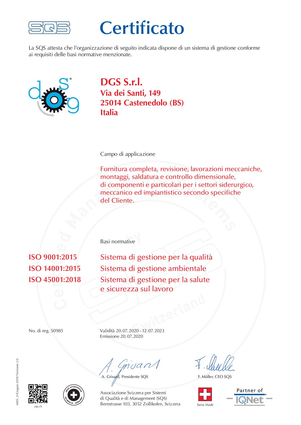 DGS srl è lieta di comunicare a tutti i propri clienti e fornitori l’avvenuta certificazione ISO 45001:2018 da parte dell’azienda certificatrice SQS.