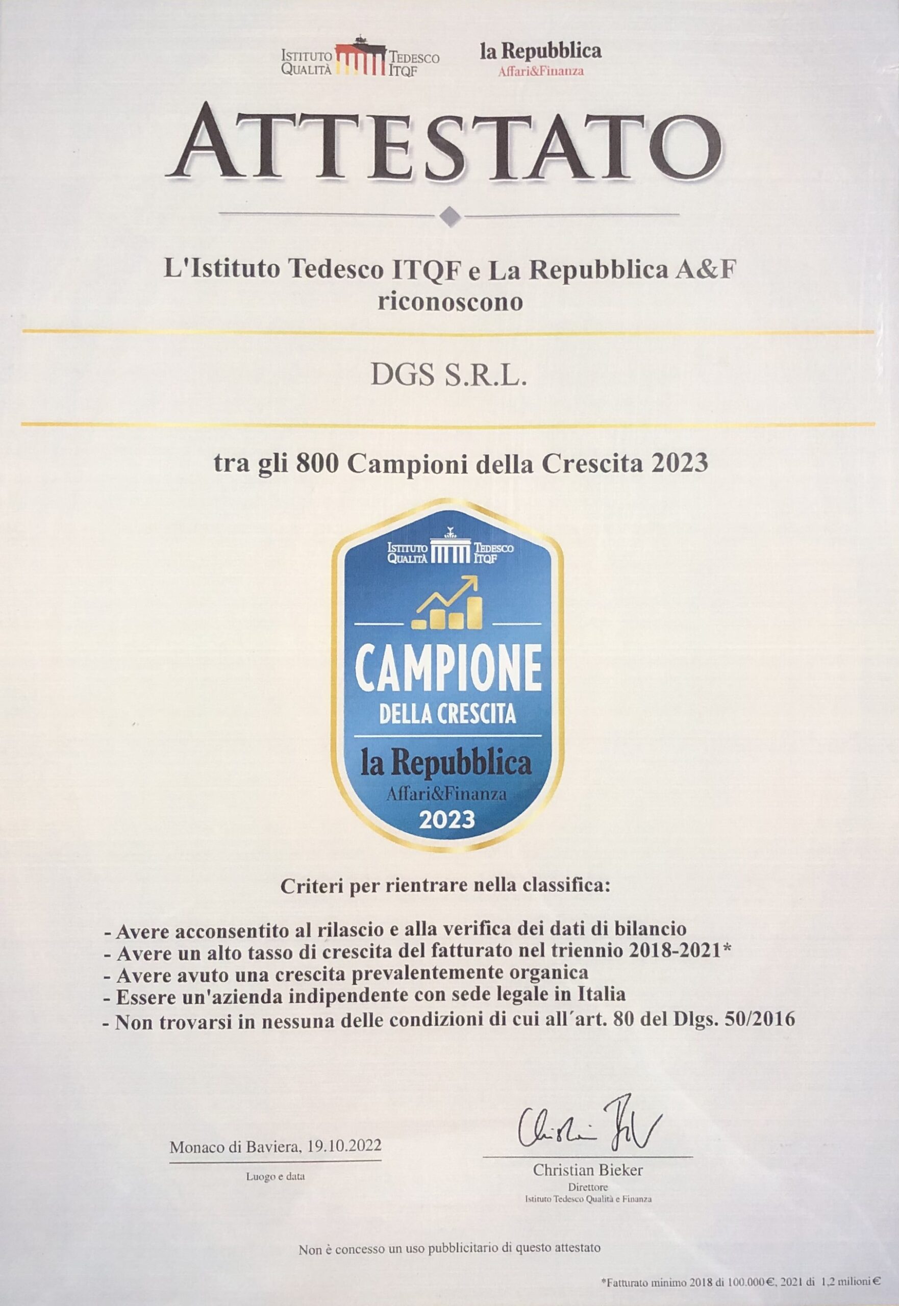 Grazie a uno studio condotto dall’Istituto Tedesco di Qualità ITQF e da La Repubblica Affari & Finanza, DGS s.r.l. è stata classificata tra le 800 aziende con il più alto tasso di espansione economica e di crescita in Italia nel triennio 2018-2021. Si tratta di un traguardo molto importante, che ci permette di distinguerci dai nostri concorrenti e di attrarre nuovi partner commerciali, clienti e nuove opportunità di business.